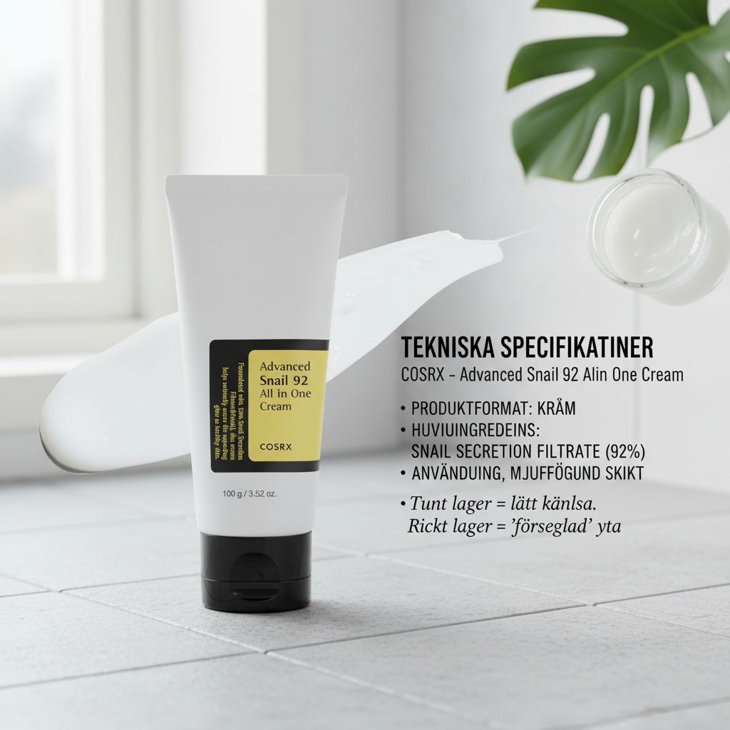 COSRX - Advanced Snail 92 All in One Cream är en allt-i-ett-kräm i tubformat som ofta används som sista fuktgivande steg för att mjuka upp huden och minska känslan av stramhet. Formulan är framtagen för att ge en skyddande, behaglig yta utan att kännas som en tung ”film”, men upplevelsen påverkas av hur mycket som appliceras och vilka produkter som ligger under. Nedan följer praktiska svar om applicering, frekvens, kombinationer och förvaring, så att krämen kan integreras på ett sätt som passar en vardagsrutin.